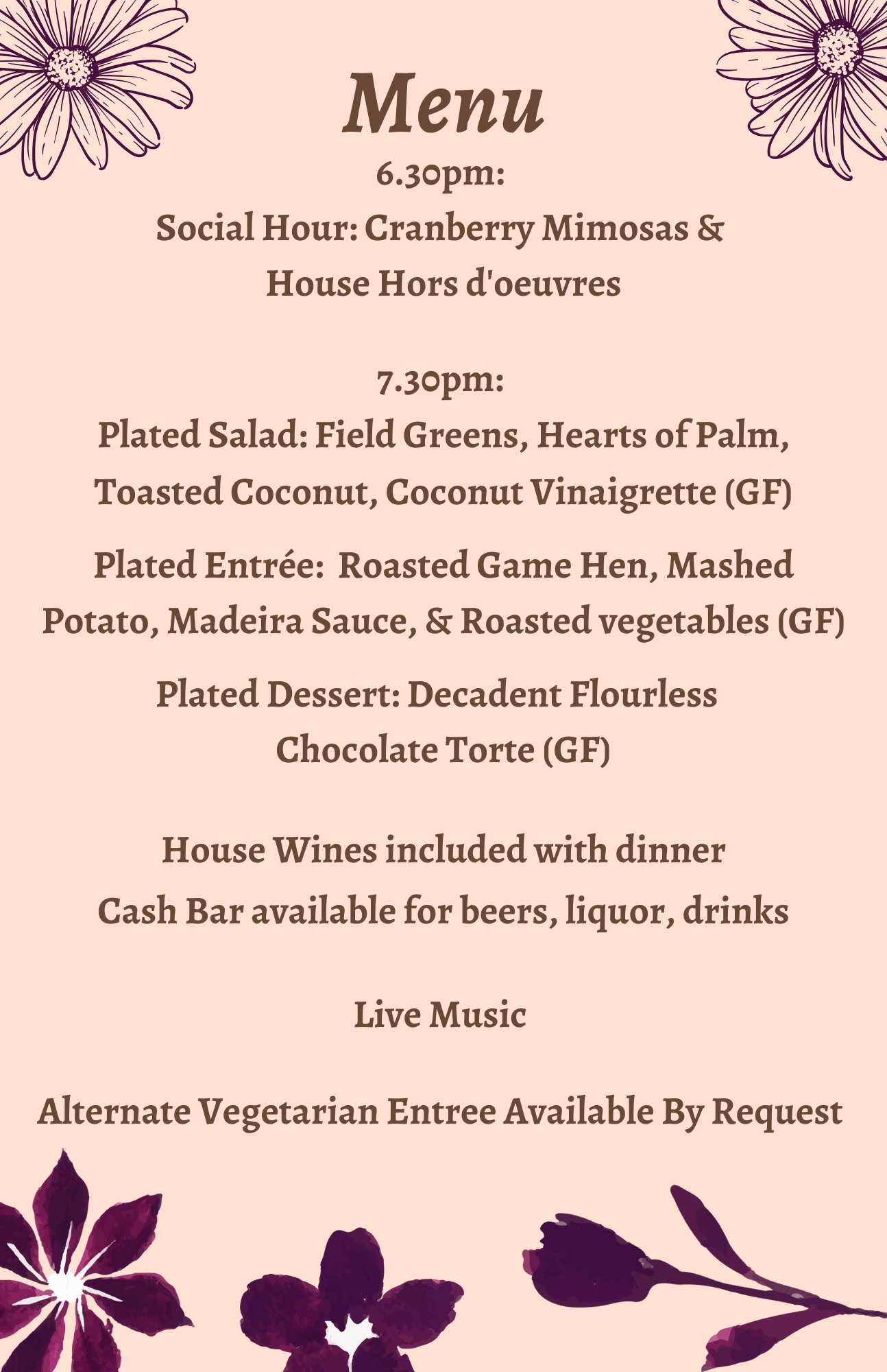 Please let us know ahead of time if you are vegan/dairy free or have any other dietary requests.